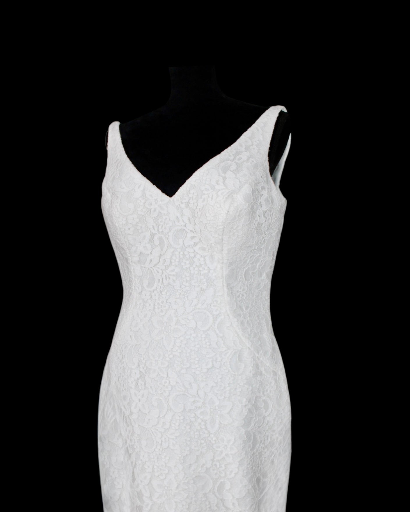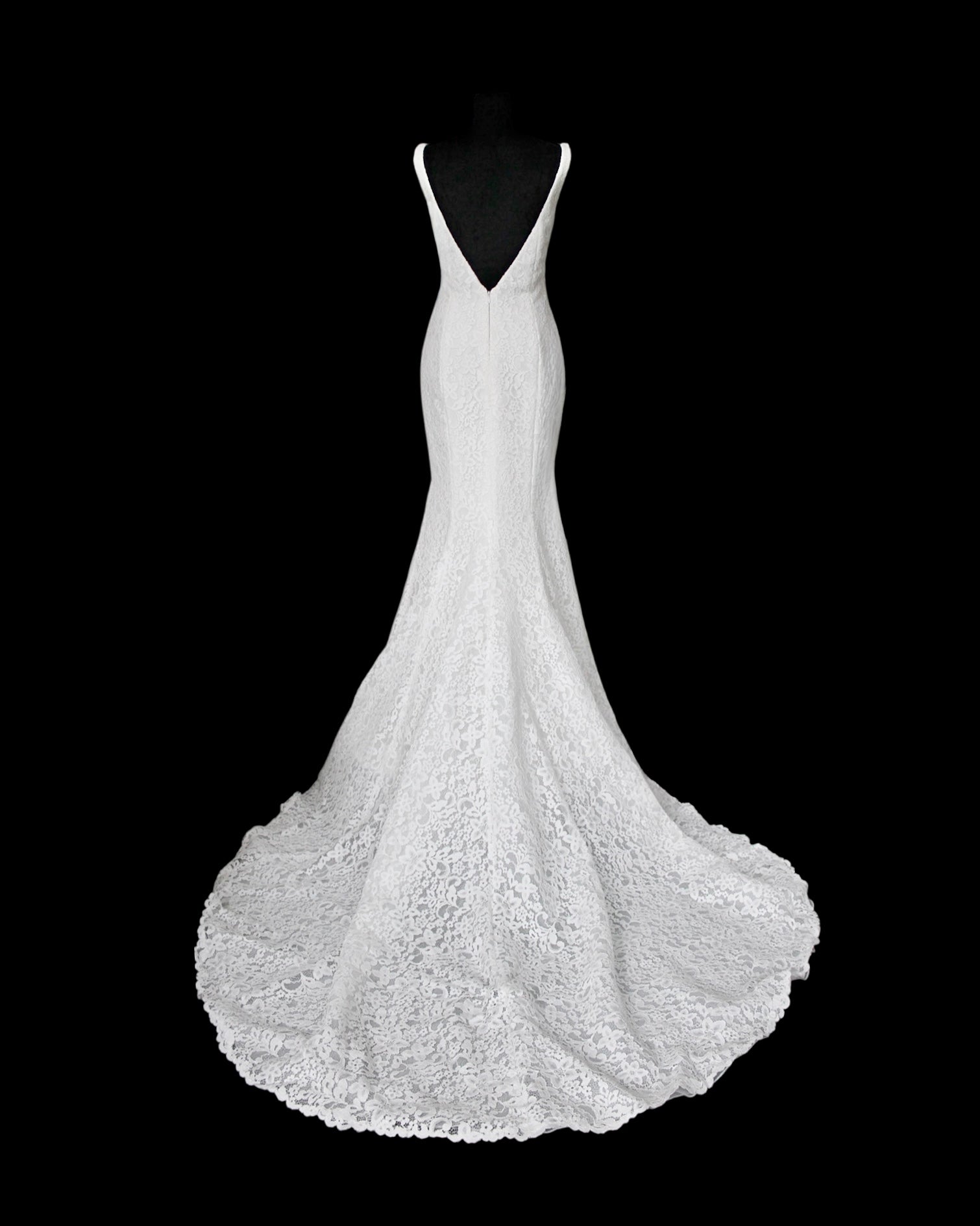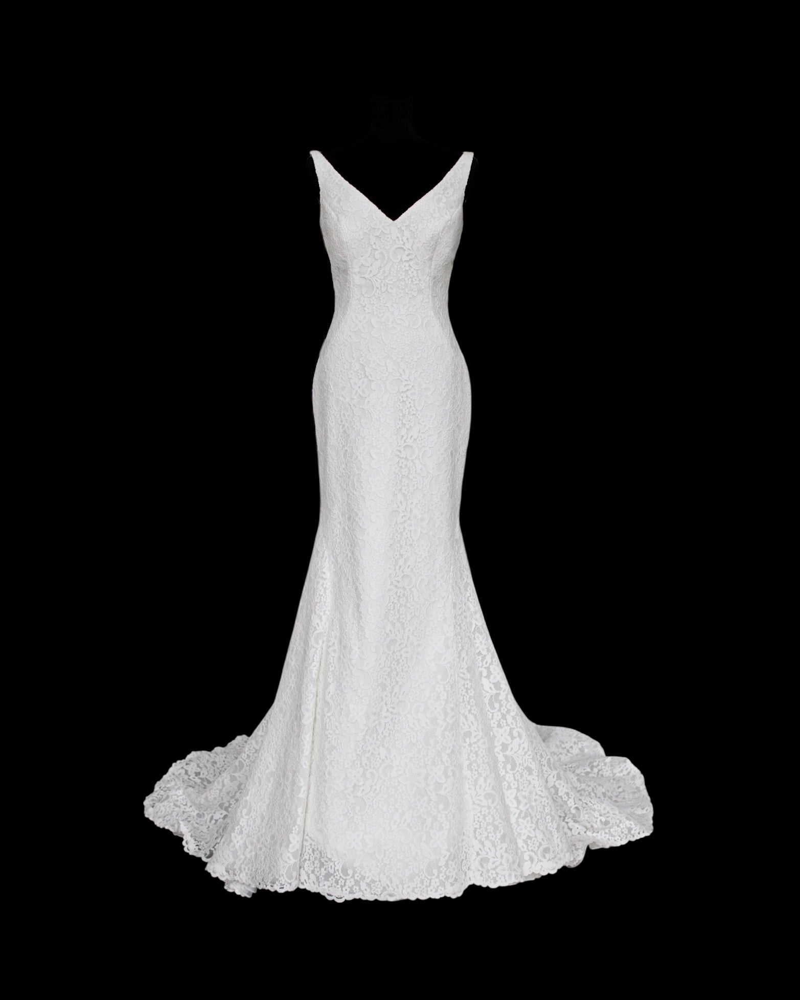 Istuva yläosa on muotoiltu selkeälinjaisella V-pääntiellä ja leveillä olkaimilla, jotka tuovat tasapainoa merenneito siluettiin. Puku myötäilee vartaloa ja avautuu kevyesti levenevään pitsihameeseen, jota täydentää hillitty laahus. Yhtenäinen pitsipinta luo rauhallisen ja eheän kokonaisuuden.
