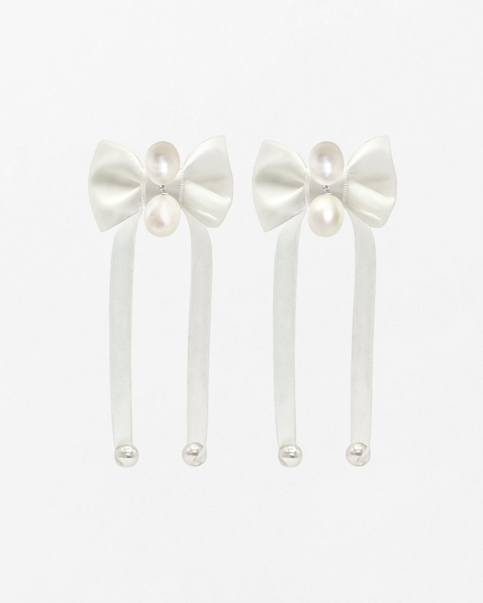 Nina Earrings are a must-have staple in your wedding wardrobe. Beautiful statement bow is made with soft silk ribbon that has a beautiful luster. Attached to a beautiful freshwater pearl earring. Nina Earring is super versatile and can be worn in two ways. The silk bow is attached to the back of the earring and the pair is provided with extra earring backs allowing you to wear the freshwater pearl earring separately.