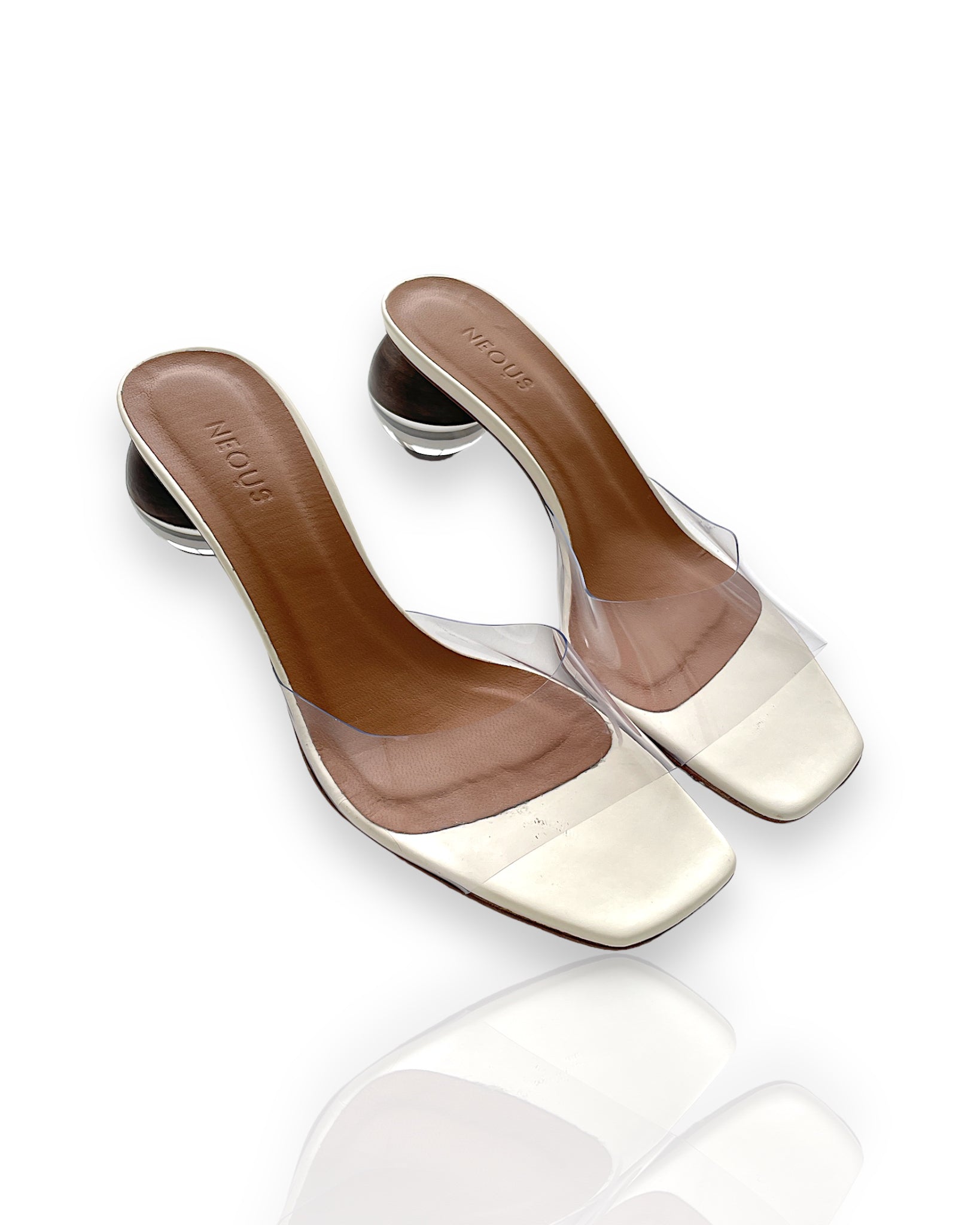 The Neous Opus leather mid-heel sandals in pristine white—a fitting name considering they're veritable works of art. Their design features an open square toe, complemented by a sleek transparent PVC strap across the front. With a leather insole ensuring comfort, they're elevated by a unique wood and plastic sphere heel, standing at 50 mm tall. Step into luxury with these statement-making sandals. Made in Italy.