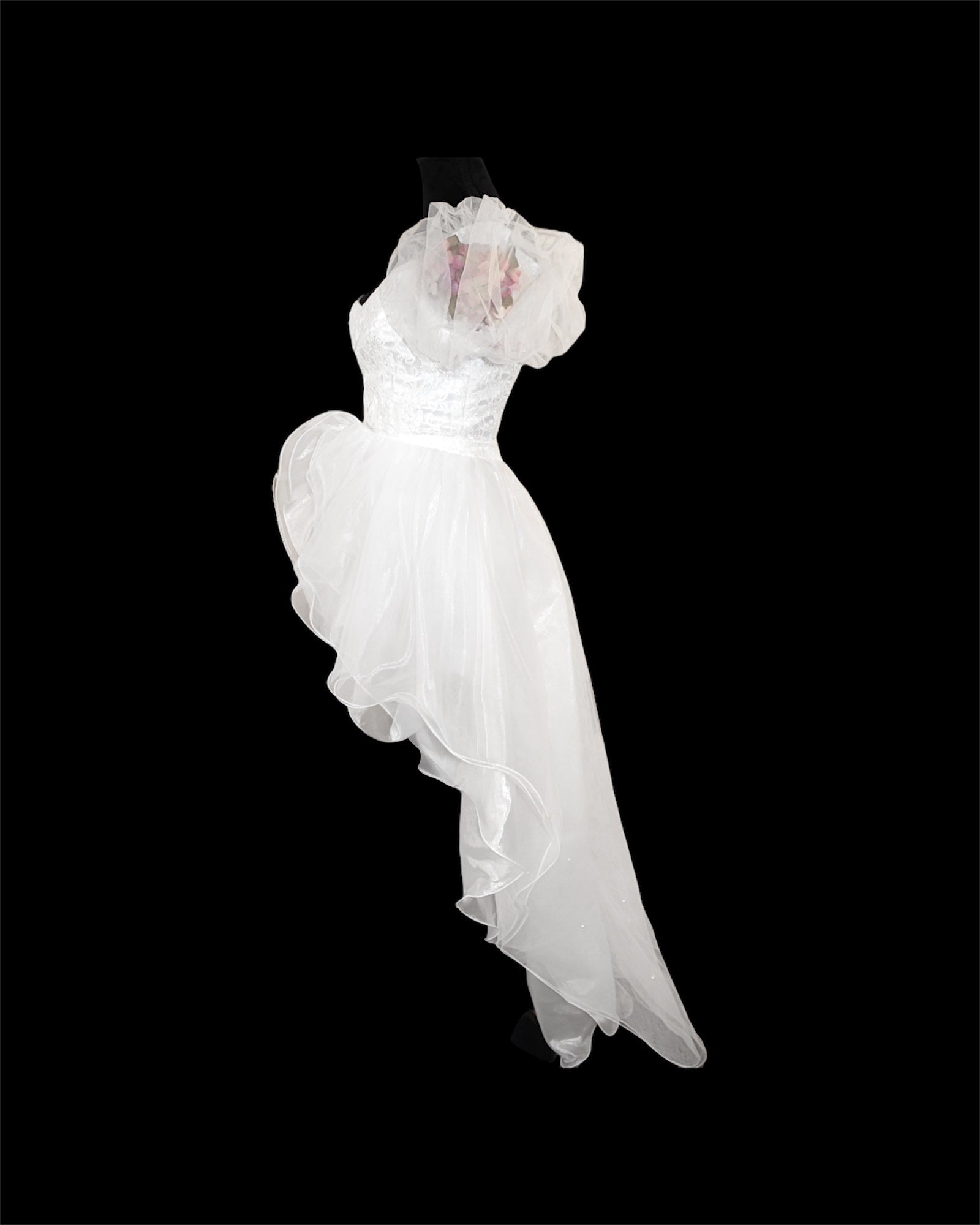 Tämä kaunis kaksiosainen hääasu sisältää polvipituisen pitsimekon, jossa on puhvihihat. Hihojen sisäpuolta koristavat vaaleanpunaiset silkkikukat. Kokonaisuuden viimeistelee irrotettava high-low-päällyshame.